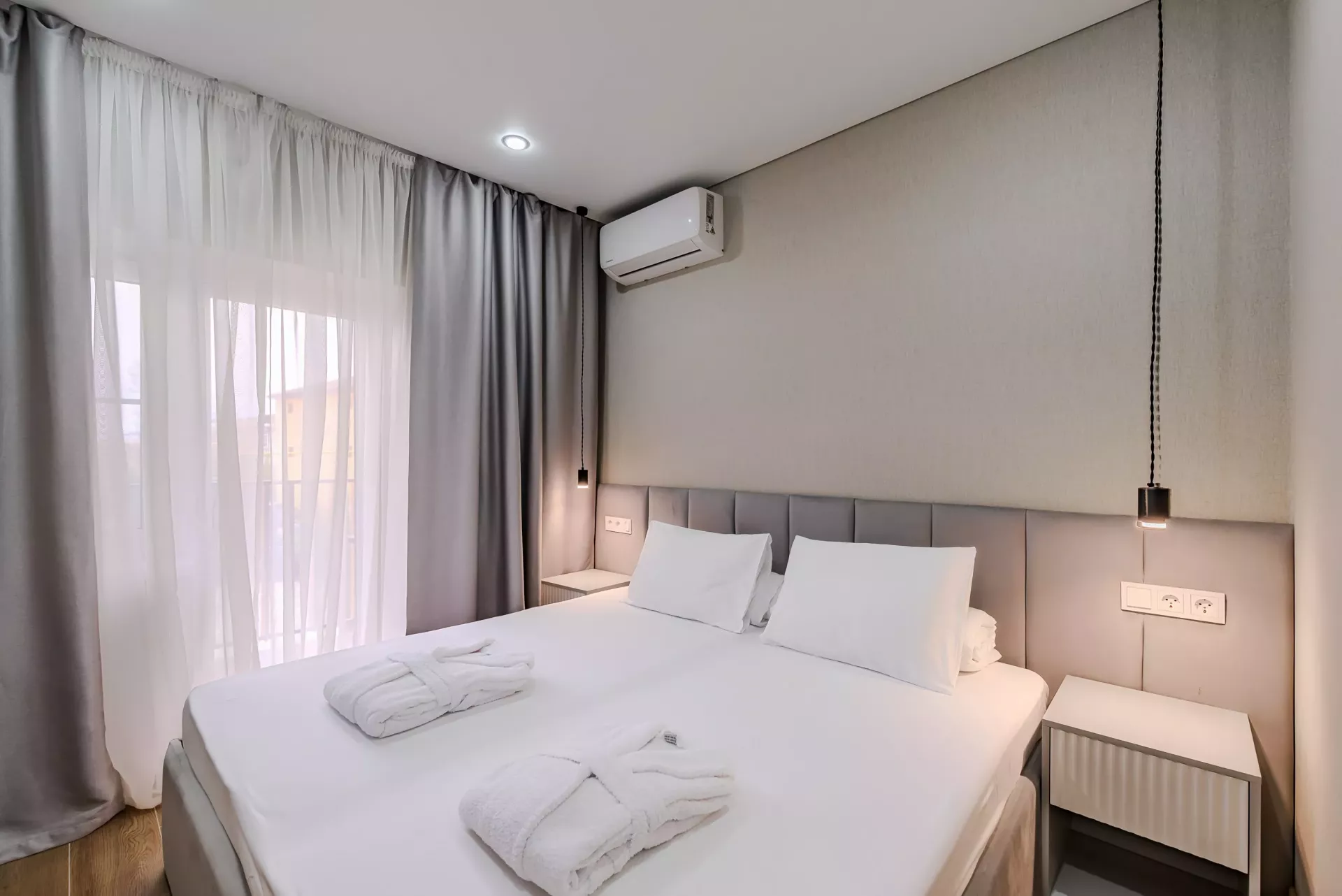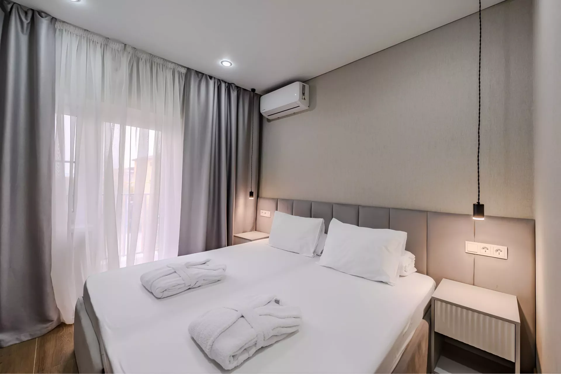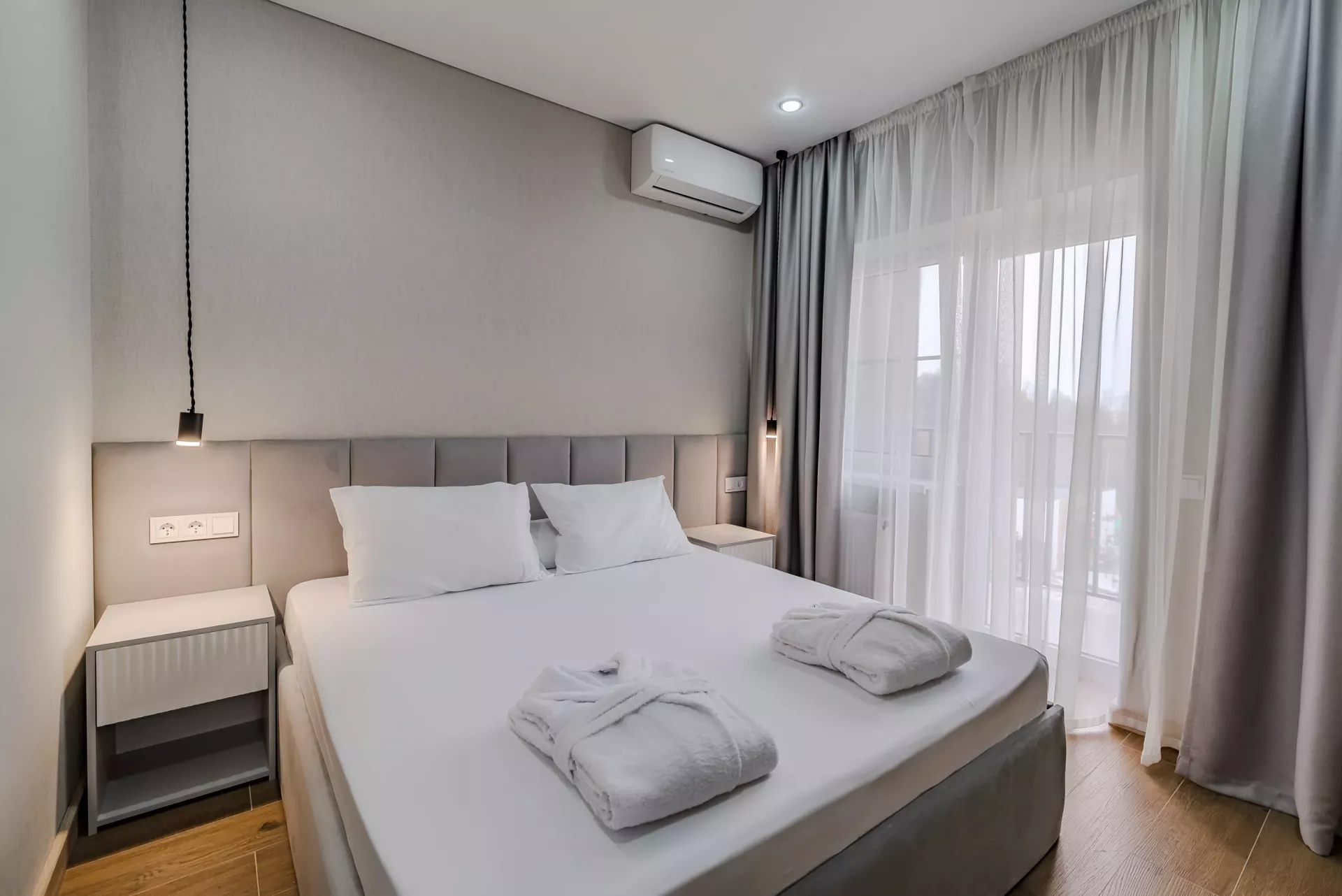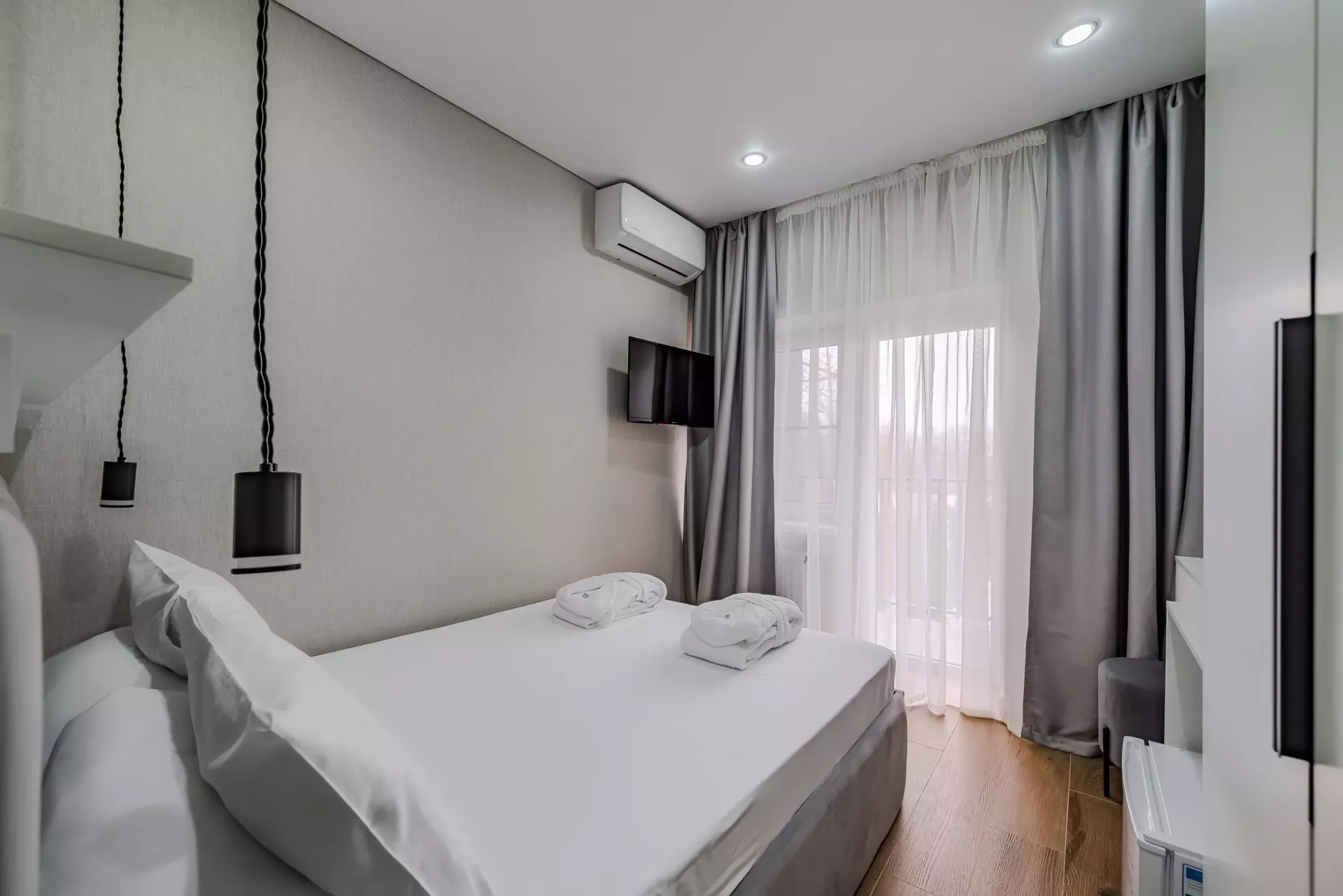В гостинице 62 уютных номера с современным интерьером. Можно забронировать стандартный, улучшенный или двухкомнатный с верандой. В каждом варианте размещения есть кондиционер, телевизор, холодильник, сейф, санузел с душем или ванной.