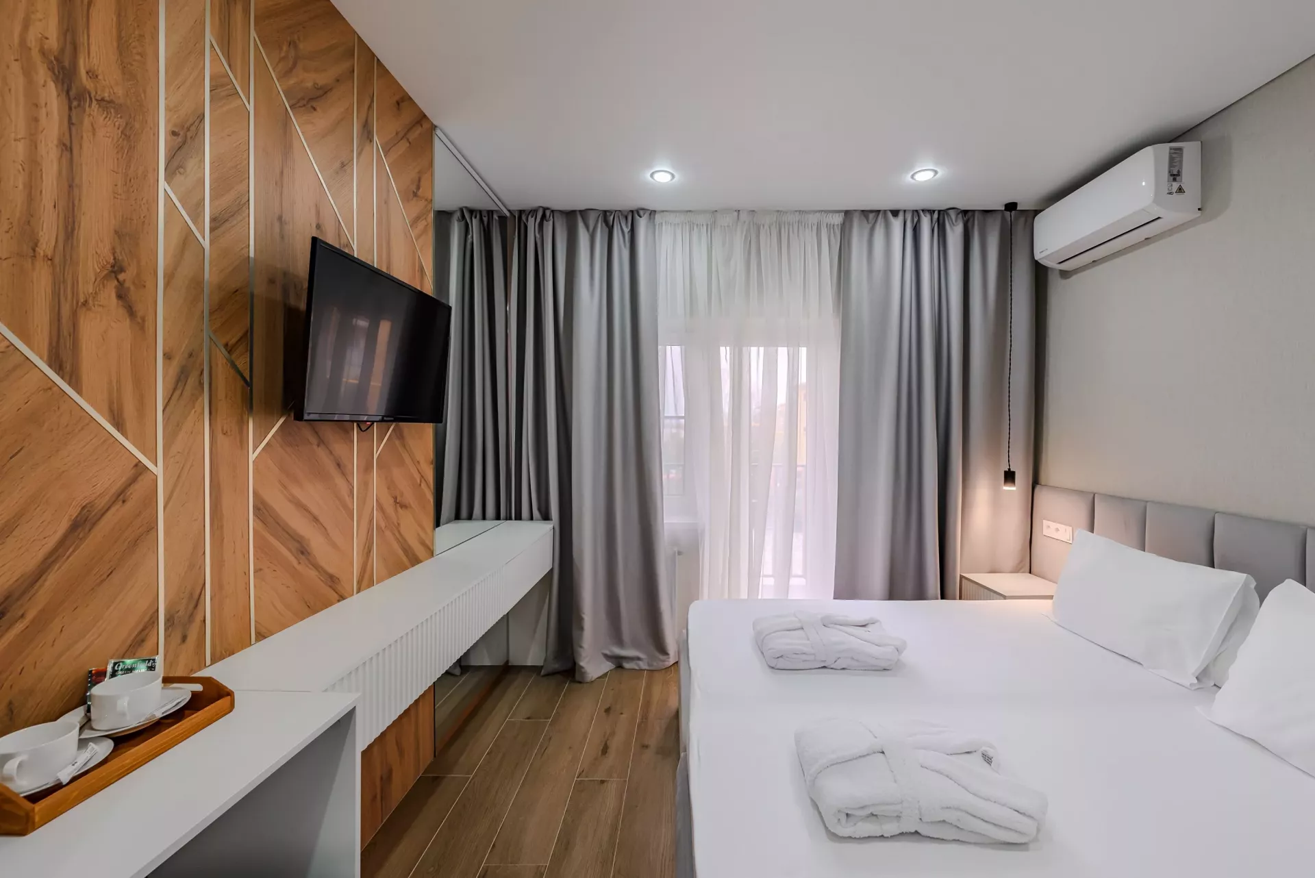 Уютный, однокомнатный номер общей площадью 14 кв.м. с двуспальной или раздельными кроватями, прикроватной тумбой, столиком, чайной станцией. Оборудован кондиционером, ЖК-телевизором, бесплатной связью Wi-Fi, мини-холодильником, сейфом. Санузел оснащен душевой кабинкой, феном, туалетными принадлежностями.